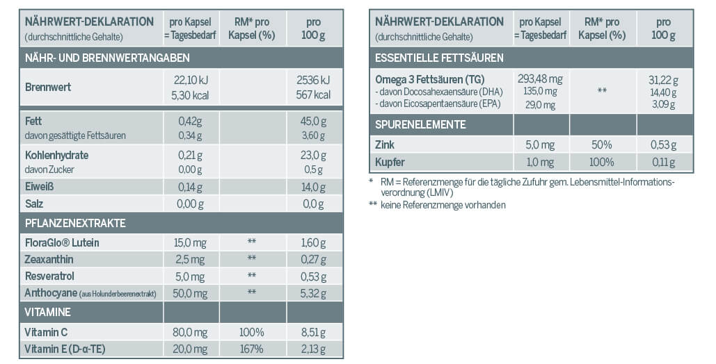 Nahrungsergänzung mit 5mg Resveratrol, 50mg Anthocyanen aus Holunderbeerenextrakt, 15mg FloraGlo Lutein, Zeaxanthin, Vitamin C+E, Zink und Kupfer.